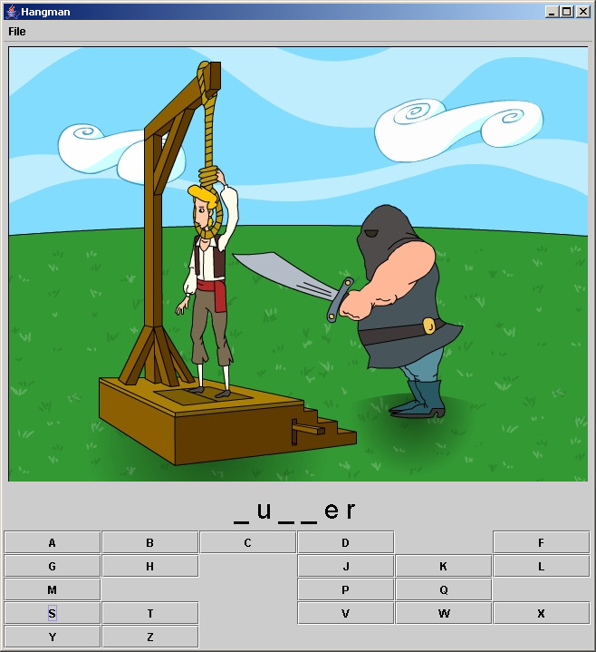 For those who are not familiar with it, the premise of the game is quite simple. The player is presented with the challenge of uncovering a hidden word (each letter of the word is represented by a dash). The player begins by guessing letters he suspects are in the word. If a guessed letter is in the word, its corresponding dashes are replaced, and the word begins to take shape. If it is not in the word, an image is displayed bringing the player's character another step closer to his death. The goal is to guess the entire word before the character meets his untimely demise.