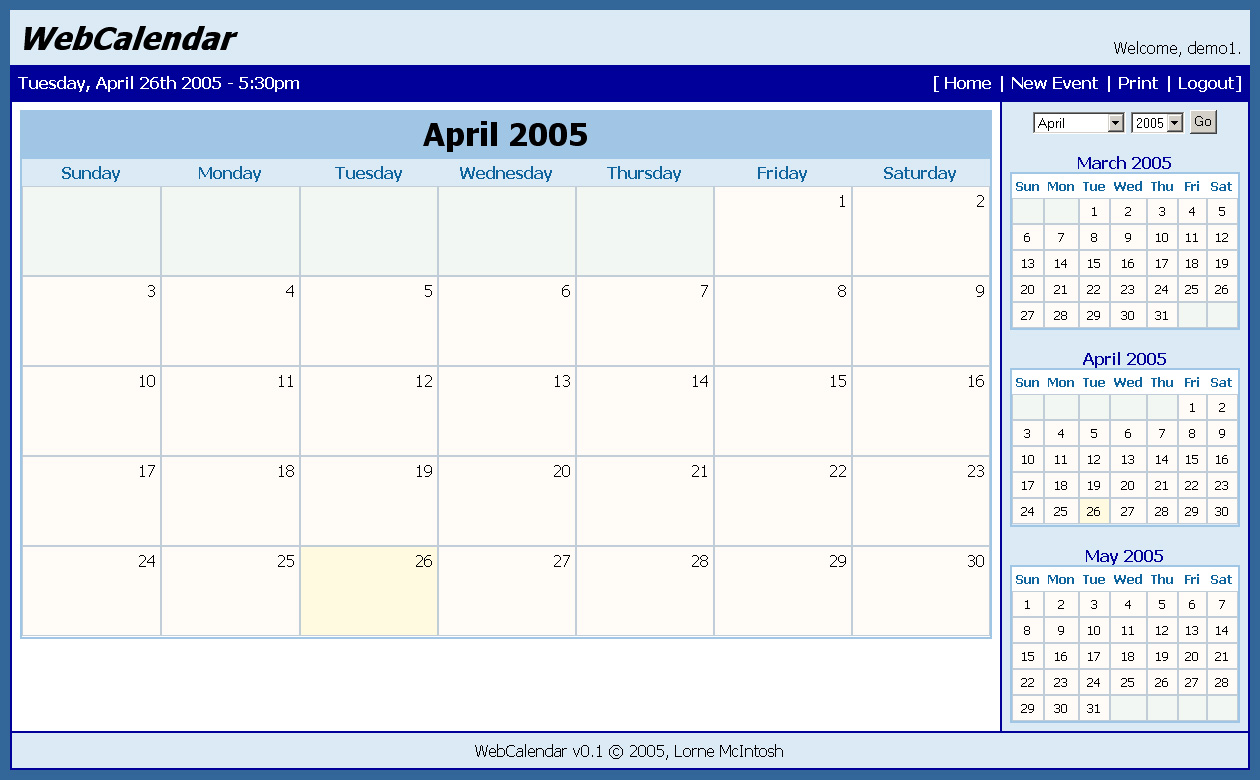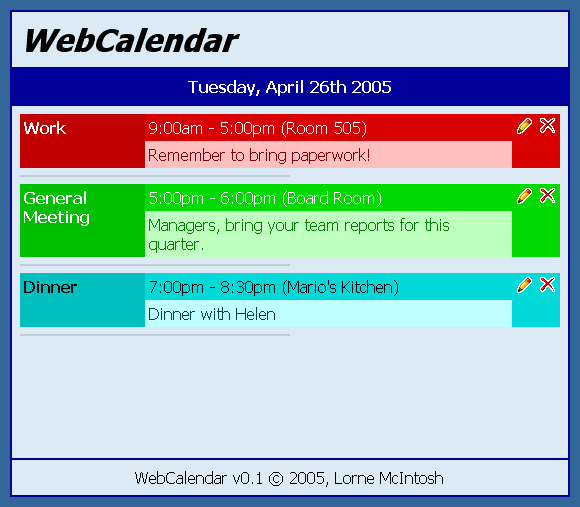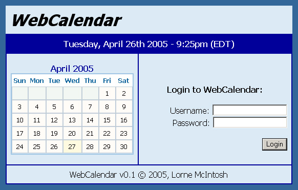 I started the WebCalendar project in September 2004 as a way of teaching myself some PHP and database skills. Since then, through use in several school projects, I have enhanced WebCalendar to the point where it is at least semi-useful as a personal organizational tool.