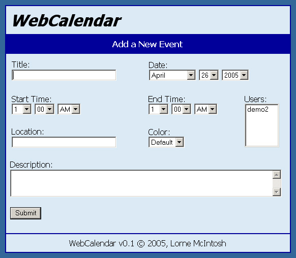 Below you can see some screenshots of WebCalendar. You can also download the source code and try it yourself (although I don't really recommend using it; there are plenty of better options out there).